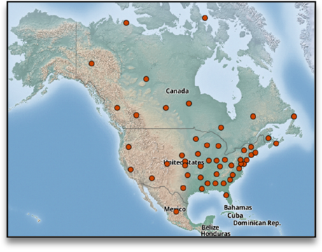 <그림1 : 북미 재선충 발병 분포도, 출처: Centre for Agriculture and Bioscience International (CABI)>