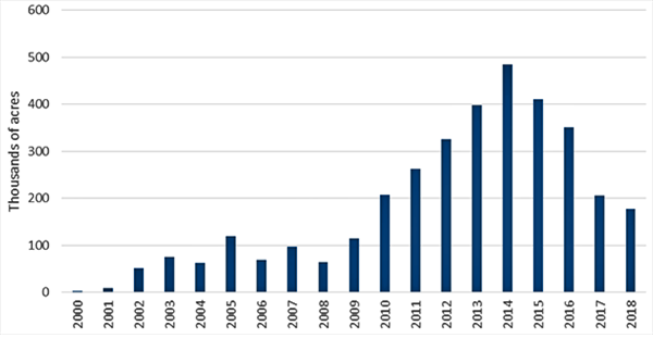 <그림2 : 하늘소에 의해 영향을 받은 산림 면적, 1996-2018, 단위: 천 에이커. 출처:https://csfs.colostate.edu/forest-management/common-forest-insects-diseases/spruce-bark-beetle/>